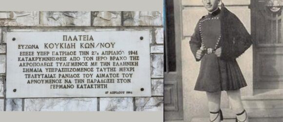 Τὴν 27ην Ἀπριλίου 1941 ὁ Μέγιστος Νέος Ἐθνομάρτυρας Κωνσταντίνος Κουκίδης ἐτυλίχθη μὲ τὸ ἱερὸ σύμβολον, τὴν σημαία μας, καὶ ἔπεσε ἀπὸ τὸν βράχον τῆς Ἀκροπόλεως (διὰ νὰ μὴν τὴν παραδώσῃ εἰς τὸν ναζὶ κατακτητὴ Γερμανό)