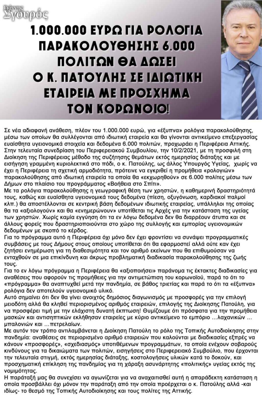 Γ. Σγουρός: 1.000.000 ευρώ για ρολόγια παρακολούθησης 6.000 πολιτών θα δώσει ο κ. Πατούλης σε ιδιωτική εταιρεία με πρόσχημα τον κορωνοϊό!