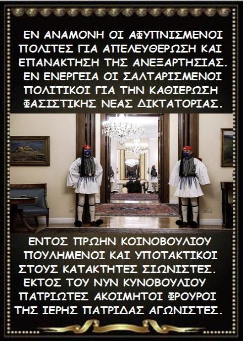 Με εργαλείο το φίμωτρο και τα εμβόλια δοκίμασαν πόσα ανθρωπάκια τούς πιστεύουν κι εκτελούν τις παράλογες διαταγές τους. Μα κατάλαβαν πως δεν είναι όλοι οι Έλληνες υποτακτικοί. Με ειρηνικές διαδηλώσεις έδωσαν το μήνυμα στους προδότες, πως οι ατρόμητοι Έλληνες δεν φοβούνται και αντιστέκονται. Το μόνο που μένει ακόμα ως την Απελευθέρωση, είναι να ξυπνήσουν και όσοι Ελληναράδες παραμένουν ακόμα στον υπναλέο κόσμο τους. Αυτοί θα συνέλθουν μόνο, όταν νιώσουν να απειλείται και η ζωή τους. Εν αναμονή της ΑΦΥΠΝΙΣΗΣ!