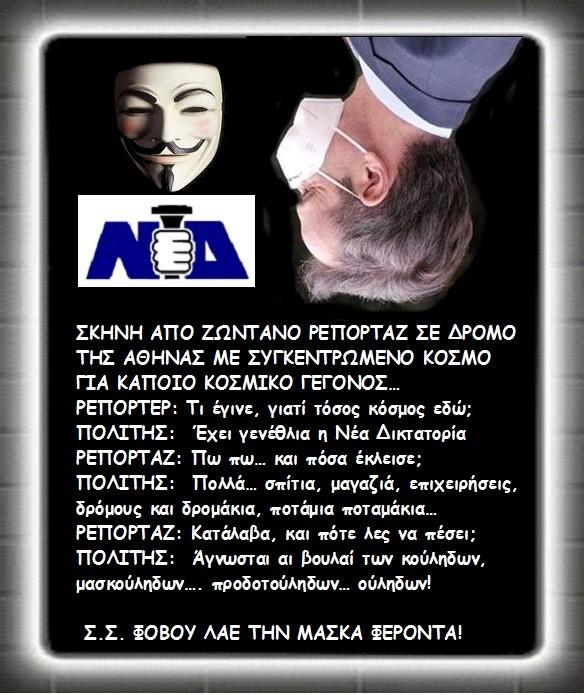 Τους επέβαλλαν να φορούν ένα μπλε πανί στο πρόσωπο, που το είπαν μάσκα, ενώ η μάσκα είναι αποκριάτικο αξεσουάρ και σκεπάζει μόνο τα μάτια. Ποιος ο λόγος να δεχτούν αυτή την επιβολή από τους πραγματικούς μασκαράδες; Να γίνουν δηλαδή μασκαράδες και οι νομοταγείς πολίτες; Ερώτημα αντί για μάσκα, στους μεν και στους δε, για το κούφιο κεφάλι τους.