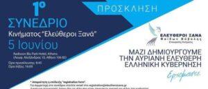 «Με ιδιαίτερη χαρά, σας πρ8σκαλούμε στο 1ο Συνέδριο του κινήματος “Ελεύθεροι Ξανά” που θα πραγματοποιηθεί την Κυριακή 5 Ιουνίου στο Radisson Blu Hotel, Athens. Το Συνέδριο θα διαρκέσει από τις 09:00 ως τις 16:00. Θα ακολουθήσει συνέντευξη τύπου του Προέδρου!