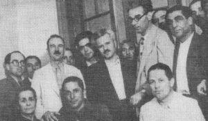 Ο Νίκος Ζαχαριάδης (στο μέσον, καθήμενος) με την μητέρα του Ερατώ, μετά την επιστροφή του στην Ελλάδα από το Νταχάου, τον Μάϊο του 1945. Πίσω, στην πρώτη σειρά, όρθιοι από αριστερά, οι: Στρίγγος, Σιάντος, Παρτσαλίδης, Πορφυρογένης και Γαβριηλίδης.