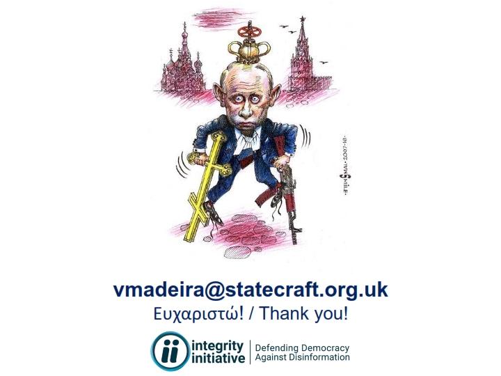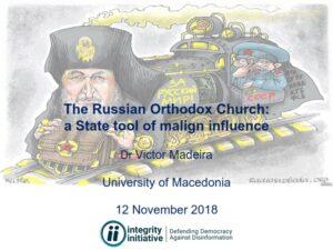 Με ανάλογο τρόπο όπως κατασκεύασαν λάσπη και την έριχναν εναντίον των Ελλήνων πριν από μία δεκαετία για να επιβάλουν τα Μνημόνια, κάνουν και για την Ρωσία. Το έγγραφο που παρουσιάζουμε (τμήμα των εγγράφων της ΜΚΟ που διέρρευσαν από hackers το 2018) αποτελεί τμήμα των περιεχομένων ενός σεμιναρίου που έγινε στο Πανεπιστήμιο Μακεδονίας στις 12 Νοεμβρίου 2018. Ομιλητής ήταν ο Victor Madeira (ακαδημαϊκός σε θέματα κατασκοπίας, ιστορίας κλπ), μεγαλοστέλεχος του Integrity Initiative και το παρουσίασε με τίτλο “H Ρωσική Ορθόδοξη Εκκλησία: ένα κρατικό εργαλείο κακόβουλης επιρροής. Σε άλλα έγγραφα που διέρευσαν οι Άγγλοι το ονομάζουν Πανεπιστήμιο Θεσσαλονίκης, για να μην συνδέσουν το «Μακεδονίας» με την Ελλάδα. Εκπαιδεύτηκε ο Πυρήνας της Ελλάδας (Greek Cluster). Σε ένα ελληνικό εκπαιδευτικό ίδρυμα, δηλαδή, οι Εγγλέζοι και άλλοι παρακρατικοί «εκπαίδευσαν» στρατολογημένους Έλληνες κατά της Ελλάδας και της ελληνορωσικής συνεργασίας. Προφανώς, ανάλογες παρουσιάσεις (αν όχι την ίδια) έκαναν και σε άλλες χώρες.