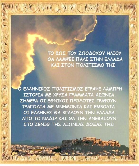 Ο Ελληνικός Πολιτισμός έγραψε λαμπρή Ιστορία με χρυσά γράμματα. Μα σήμερα οι προδότες μας γράφουν τραγωδία με μαύρα γράμματα. Αποφασίζουν για μας κι εκτελούν εντολές έξωθεν, σαν να είμαστε ανύπαρκτοι, σα να μην έχουμε γνώμη και δικαιώματα για την ζωή μας. Μάλλον μας θεωρούν χαμένους στο διάστημα κι αντί για όνομα μας έδωσαν αριθμό. Μα εμείς μπορούμε αν το θελήσουμε, να αποτινάξουμε τον ζυγό ως άνθρωποι ανεξάρτητοι και δημιουργικοί. Σίγουρα θα ανατρέψουμε και τους προδότες ως περήφανοι ΕΛΛΗΝΕΣ!
