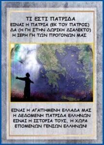 Τί είναι άραγε η Πατρίδα; Η ετυμολογία της λέξης περιγράφει ακριβώς την έννοιά της: Πάτρια (εκ του πατρός) Δα (η γη στην Δωρική διάλεκτο). Την γη των πατέρων μας όριζαν ως Πατρίδα οι πρόγονοί μας, άσχετα αν σ’ αυτή ζούσαν πλούσιοι ή φτωχοί ή αστοί. Οι προοδευτικοί και θεωρητικοί πολίτες μιλούν πάντα με απέραντο σεβασμό για την Πατρίδα και το Ελληνικό Έθνος.