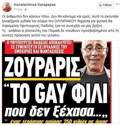 Ένας Υπουργός και μάλιστα της Παιδείας, θα πρέπει πρωτίστως να έχει ήθος, μέτρο λόγου και κοινωνική παιδεία! Δεν αρκεί μόνο η μόρφωσή του! Ο Κώστας Ζουράρις, περί αυτού ο λόγος, προκάλεσε για άλλη μια φορά με τις χυδαίες αναφορές του, σε συνέντευξη που έδωσε στο ραδιόφωνο “Metropolis 95,5” της Θεσσαλονίκης! Άναψε για άλλη μια φορά φωτιές και ξεσήκωσε τους φιλάθλους του Ολυμπιακού και του Άρεως!