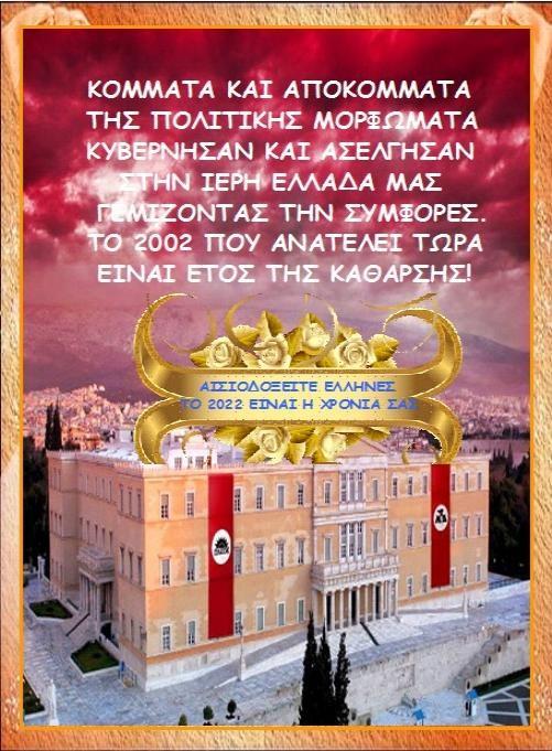 Γιατί επιτρέπεις να παίζουν με το μυαλό σου, να κλέβουν την πατρίδα σου; Συνειδητοποίησε επιτέλους τον ύψιστο θανάσιμο κίνδυνο και ξεκίνα Αγώνα, για να την υπερασπίσεις, ως Άξιος πατριώτης. Δείξε πως είσαι γεννημένος αγωνιστής και ξέρεις πως να διεκδικείς το Δίκιο σου. Εμείς οι εναπομείναντες σκεπτόμενοι Έλληνες γνωρίζουμε πως το 2022, είναι έτος της ΚΑΘΑΡΣΗΣ από την «πολιτική πανδημία»! Η χρονιά των ικανών Ελλήνων, που θα οδηγήσουν πάλι την Ελλάδα στον δρόμο των πεπρωμένων της. Ενημερώσου σωστά, σκέψου θετικά και θα νικήσεις, γιατί η ΓΝΩΣΗ ΕΙΝΑΙ Η ΔΥΝΑΜΗ ΣΟΥ.
