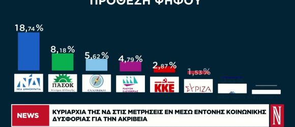 Διαβάστε περισσότερα»Kυριαρχία της ΝΔ στις μετρήσεις εν μέσω έντονης κοινωνικής δυσφορίας για την ακρίβεια