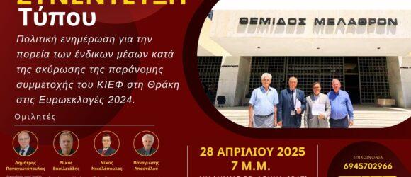 Στις 28-4-2025, Ημέρα Δευτέρα και ώρα 19:30 στην ΕΣΗΕΑ 3ος Όρ. Ακαδημίας 20, σας καλούμε να λάβετε μέρος στη Συνέντευξη Τύπου της πρωτοβουλίας για την Παράνομη Αναγνώριση του ΜΕΙΟΝΟΤΙΚΟΥ Κόμματος ΚΙΕΦ στη Θράκη (Ροδόπη και Ξάνθη).